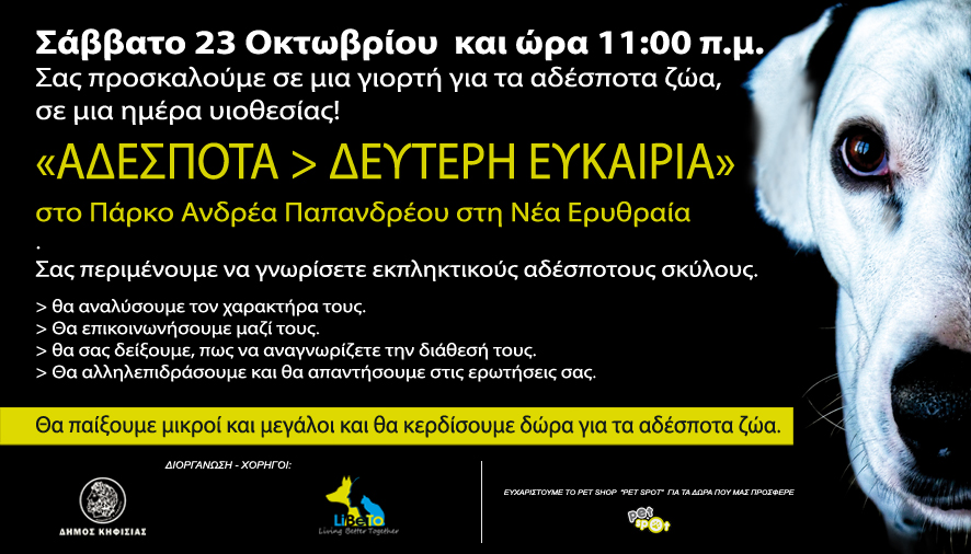 Continue Reading →Μια γιορτή για τα αδέσποτα, μια ημέρα υιοθεσίας, 11:00 π.μ. εως 02:00 μ.μ. στο Πάρκο Ανδρέα Παπανδρέου, στη Νέα Ερυθραία….